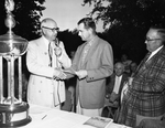 Lloyd Mangrum, center, shaking Amon Carter's hand as he speaks into a microphone at the Colonial Invitational Golf Tournament presentation ceremonies.