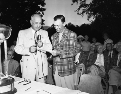 Lloyd Mangrum, right, takes the microphone for a speech after having been given his second-place check for $2,700 and a plaid Colonial jacket by Amon Carter, left, at the presentation ceremonies.