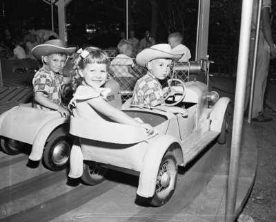 Parks are for children and aside from zoos and other live attractions, the rides are a source of great entertainment. Pictured today are children enjoying "school's out" fun at the park. Side-by-side tiny motors bear a trio of ambitious riders: Freddie Lynn Shaw, center, daughter of Mr. and Mrs. Fred C. Shaw, 2922 Fincher; and Roger, left, and Michael Henry, sons of Mrs. Claudia Henry, 4224 Lorin.