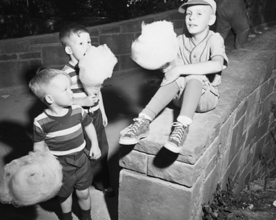 Parks are for children and aside from zoos and other live attractions, the rides are a source of great entertainment. Pictured today are children enjoying "school's out" fun at the park. Wearing a miniature "Cat" baseball suit, Michael Watson, right, son of Mr. and Mrs. John A. Westbrook, 1228 Boyce, is the envy of Phillip, front, and Michael, sons of Mrs. Darrell Wilemon, 5501 Hampshire South. The boys are all holding cotton candy.