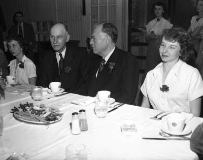 Arlington State College President E. H. Hereford, left, and Dr. F. C. Bolton, president of Texas A&M College, at luncheon for the directors. Published in Fort Worth Star-Telegram morning edition March 26, 1950.
