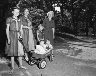 Parks are for children and aside from zoos and other live attractions, the rides are a source of great entertainment. Pictured today are children enjoying "school's out" fun at the park. All ages enjoy an afternoon at the park. Left to right are Judy Tolson, her mother, Mrs. E. O. Tolson and Barbara Jean Tolson, dressed alike; and the girls' grandmother, Mrs. W. L. Forbes; in the little red wagon are the Tolson twins, Jane and Gary. The family lives at 3040 Kerry Lane.