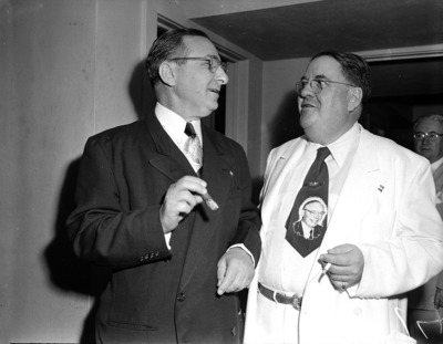 There was no doubt as to the partisanship of these Republican visitors to the GOP state convention at Mineral Wells. A. E. Dumont of Paducah, right, sports an Eisenhower the while Mike Nolte, left, state committeeman from San Antonio had one tied for Taft. Mike Nolte wearing white suit. The other man is unknown. Published in Fort Worth Star- Telegram evening edition, May 26, 1952.