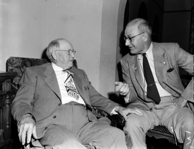 Convention eve found Texas Republicans in Mineral Wells getting set for the anticipated Taft-Eisenhower forces battle. At right, W. G. McClain, left, of Waxahachie, Ellis County Republican chairman, talks with a fellow Taft-booster, R. W. Patterson, San Antonio. Published in Fort Worth Star-Telegram morning edition, May 27, 1952.