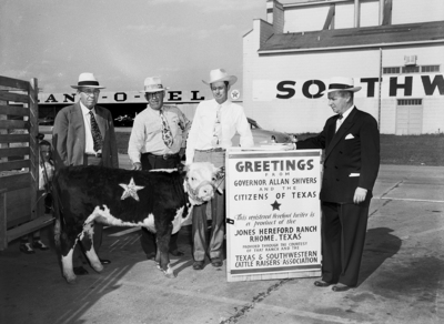 JHR Miss Symbol 710, a young cow, gets into her crate for shipment by air to a farm near Moses Lake, Washington. At left is Henry Bell, manager of the Texas and Southwestern Cattle Raisers Association; Frank D. Jones, who donated the heifer; Marvin Maberry, manager of the Jones Ranch, and William H. Gardener, who represented Governor Shivers. Published in Fort Worth Star-Telegram morning edition May 26, 1952.