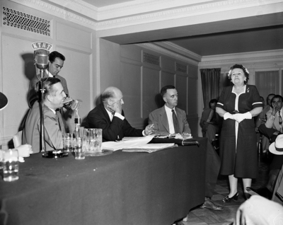 Credentials Work - Mrs. Jud Collier, right, of Mumford, member of the state Democratic executive committee, appears before a credentials committee Monday in San Antonio. Others identifiable, left to right, are Ruel Walker of Cleburne, committee chairman (seated); Wylie Stufflebeme(seated) and the committee's reporter.