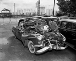 Jack Wallace Graves, 25, of Meanering Road, was injured seriously when his 1950-model coupe smashed into the rear of a truck, pinning him in the wreckage at North East 28th and North Sylvania. Inspecting the wrecked auto is Garageman Bill O' Connor. Published in Fort Worth Star-Telegram evening edition, May 27, 1950.