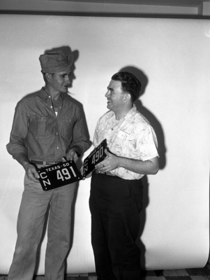 Frank S. Kelley, left, of 1331 Kings Highway, and William H. Pentek, right, of 512 Lamar, who served in the same Air Force squadron during the war and last saw each other in 1944 on Kwajalein, shown as they met in the auto license line and went on to receive consecutive license numbers.