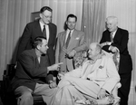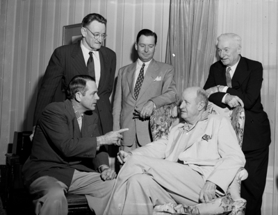 This group of Loyal Democrats conferred at San Antonio to outline their tactics for the state Democratic convention opening. Standing, left to right, are W. H. Kittrell of Dallas; J. Fagan Dickson of Austin, executive director of the Loyal Democrats, and Harry Seay of Dallas, former state chairman. Seated, left to right, are Walter Hall of League City and John D. Cofer of Austin. Published in Fort Worth Star-Telegram evening edition, May 26, 1952. Five men together in a room having a conversation with each other wearing suits.