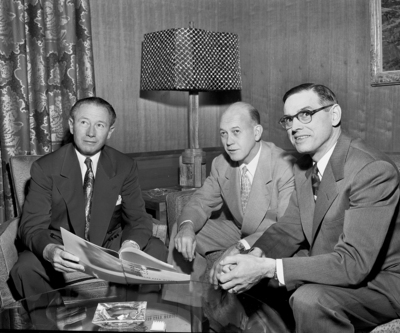 Talking over plans for General Motors Corporation's groundbreaking scheduled at Arlington are GM officials J. L. Conlon, left, John F. Gordon, middle, and E. C. Klotzburger. They expect the Arlington plant, which will turn out automobiles as well as Navy warplanes to be completed by June 1953. Published in Fort Worth Star-Telegram morning edition May 27, 1952.