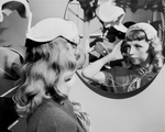 Sitting forward on the forehead is this fall Gage Handcraft hat. It's a white felt shell with a turned up back. Large pearls set in gold trim the front edge. Gage is one of about 1,000 lines showing fall merchandise at Hotel Texas. Published in Fort Worth Star-Telegram evening edition May 27, 1952.
