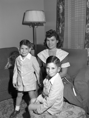 Mrs. Mike Barbolla, 2509 Mission, pictured with her sons , Patrick Anthony, 4, left, and Michael Gary, 5, in front, was installed as president of the Womens Auxiliary 44 to Typographical Union 198. The image displays Mrs. Mike Barbolla sitting with her children standing by her. Published in Fort Worth Star-Telegram morning edition May 29, 1952