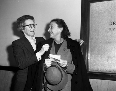 Happy over winning reluctant approval for her performances in "That Lady," laryngitis-stricken Katherine Cornell, right, leaves a doctor's office. With her is Miss Gertrude Macy, her secretary.