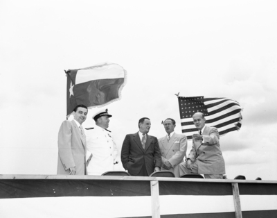 The groundbreaking ceremony for the General Motors plant to be constructed at Arlington, Texas. Left to Right, Tom Vandergriff, Captain A. C. Olney of the United States Navy, Ben Critz, J. L. Conlon, and John F. Cordon of General Motors Company standing on platform with the Texas and American flags behind them.