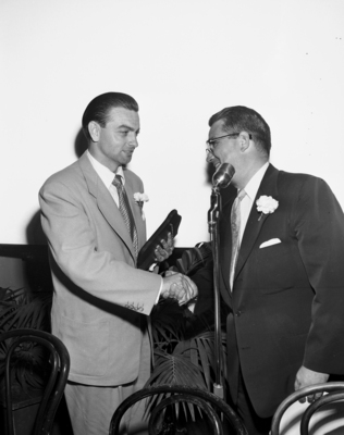 The ground breaking ceremony for the General Motors plant to be constructed in Arlington, Texas. Tom Vandergriff, left, accepts "man-of-the-year plaque from Bill Bagby.