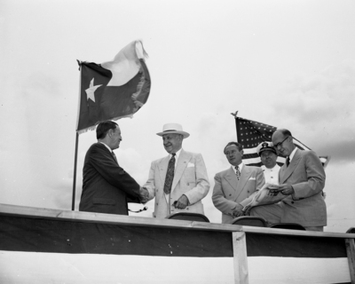 Groundbreaking ceremony for the $33,000,000 General Motors plant to be constructed in Arlington, Texas. Left to Right, Ben Critz, executive vice president of the Dallas Chamber of Commerce; Amon Carter; J. L. Conlon, General Motors executive; Navy Captain A. C. Olney of Dallas; and John F. Gordon, vice president in charge of body and assembly division of General Motors.