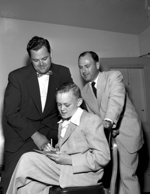 Good days at camp were remebered by both Roy Browning Senior, left, and Amon Carter Junior as Browning registered his son, Roy Browning Junior, seated, for a summer session at YMCA Camp Carter.