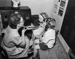 Learning to Talk - Larry Whitworth, front, and Toni Taylor, two pupils in the Opti-Mrs. Listening Eye Pre-Schol for Deaf Children, are shown with their teacher, Mrs. Marjorie Moore, and the Chromovox, an audio-visual speech aid. Mrs. Spencer Tracy will speak on behalf of the school a 8 p. m. Thursday at TCU Ed Landreth Auditorium.