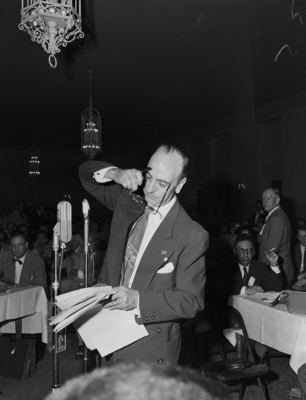Thomas E. Mosheim of Houston was a busy man he pleaded the Taft cause before the Republican executive committee at Mineral Wells. His glasses and documents kept the Houston man well occupied as he discussed the legality of the Harris County delegation. A man wearing a suit looking at documents sitting at a table. Published in Fort Worth Star-Telegram evening edition, May 27, 1952.