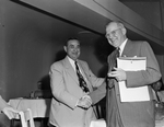 Henry Zweifel, left, Fort Worth leader for Taft, and Jack Porter of Houston, Eisenhower backer, shook hands at Mineral Wells. They reached mutual accord on the proposition it was about time to go to bed. Published in Fort Worth Star-Telegram evening edition, May 27, 1952.