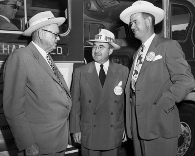 Twenty-nine Fort Worth business men left for a swing through East Texas and into Louisiana on a good will trip sponsored by the Chamber of Commerce. The group will go as far as Shreveport and Texarkana. Shown here before the chartered bus left town are M. C. Schutts of Burrus Millis; E. L. Dobbs of Armour & Company, trip chairman, and Paul D. Gregory of Scott-Palmer & Gregory. Published in Fort Worth Star-Telegram evening edition May 28, 1952.