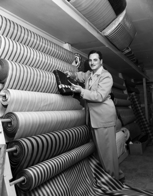 Harold Marks of Irving displays some of the new "Marks the Seat Cover King" auto upholstery shop at 7900 White Settlement Road. The image shows Harold Marks leaning on rolls of seat covers. Published in Fort Worth Star-Telegram evening edition May 28, 1952