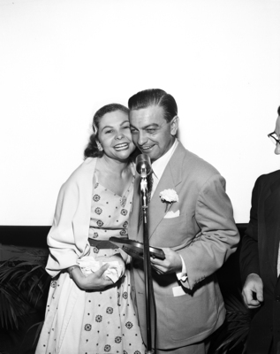 Named as Arlington's Man-of-the-Year at the Annual Arlington Chamber of Commerce banquet at Midway Inn was the city's 26 year-old mayor, Tom J. Vandergriff, who quickly received a hug from Mrs. Vandergriff. The image shows Mr. Vandergriff standing in front of a microphone with Mrs. Vandergriff by his side. Published in Fort Worth Star-Telegram evening edition May 28 1952