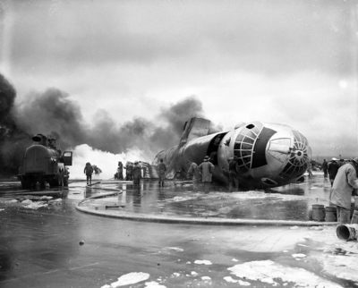 Giant Plane Goes Up In Flames - Carswell Air Force Base fire fighters are shown here as they poured chemicals on a drowned B-36 which caught fire and exploded Wednesday after landing at the base. Seven crewmen died. Ten others escaped.