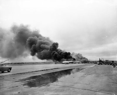 Where Seven Died - Blazing fire and black smoke envelope this B-36 bomber just after a landing at Carswell Air Force Base Wednesday. Seven fliers were killed and 10 injured in the bomber's explosion. Firefighters put the blaze out in about four hours.