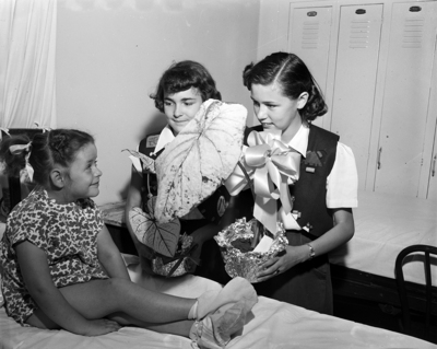 Flowers For The Sick - Patricia Jones, 5, was one of 14 patients at City-County Hospital who received pot plants Wednesday from Camp Fire girls. Presenting the plant are Linda Deist, left, of 3521 Hilltop, and Virginia Thomas of 4000 Acacia.