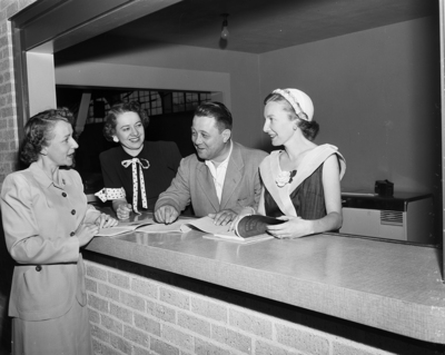 Plan Youth Center - Three officers of the Catholic Daughters of America are shown reviewing plans for a youth center for teenagers at Laneri High School gymnasium with Glenn Wilcox of the city recreation department. Left to right are Mrs. J. R. Perkins, vice president-elect; Mrs. Vincent T. Murphy, prophetess-elect; Wilcox, and Mrs. Tommy Farrell, grand regent-elect.