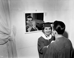 Mrs. Garnet Latshaw, 17, helps her husband Nelson, 18, adjust his graduation gown before a mirror in the couple's home at 2729 Ave. C. The Latshaws, who were married July 27, 1951, will receive their high school diplomas together from Polytechnic High. Published in Fort Worth Star-Telegram morning edition May 30, 1952