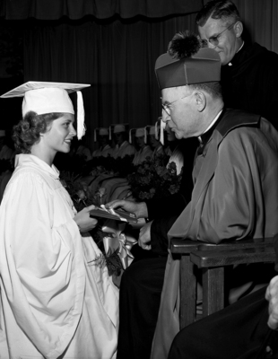 Bishop Thomas K. Gorman of Dallas confers a diploma on Miss Barbara Steffen at commencement exercises at Our Lady of Victory Academy. Miss Steffen graduated the distinction of Magna Cum Laude, is president of the graduating class. The image shows Miss Barbara Steffen receiving a diploma from Bishop Gorman. Published in Fort Worth Star-Telegram morning edition May 30, 1952
