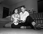 Four-month-old Darrow Jr. eyes the discuss his father, Darrow Hooper, is holding while his mother, Jeannine, watches. Pop is the Southwest Conference shot put and discus champion. The image shows Jeannine and Darrow Hooper seated with their son while Darrow holds a discus and Jeannine holds their son. Published in Fort Worth Star-Telegram morning edition May 30, 1952