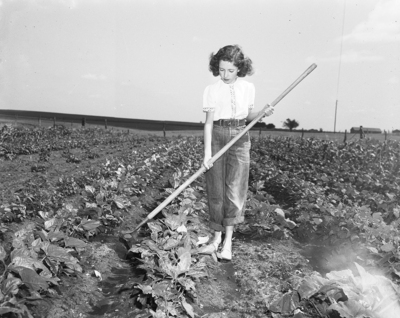There are no weeds to hoe now in this garden. Gwen Crawford is just showing how she has kept the garden clean.