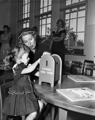 Playtime - Four year old Jackie Graves, daughter of Mr. and Mrs. Jack Graves of 2309 Columbus, Friday played with Mrs. Spencer Tracy. And it was a great occasion for all the pupils of the Opti-Mrs. Listening Eye Pre-School for the Deaf when the film star's wife paid them a visit.