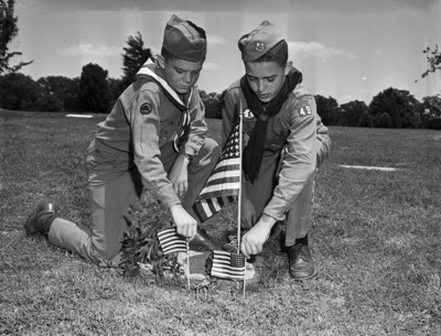 In Memory - Honoring all men who fought America's battles through its history, Willard Moon, left, of 3808 Winslow and Homer Abel of 5636 Birchman, both of Arlington Heights Methodist Church's Boy Scout Troop 43, place flags on a serviceman's grave in Rose Hill during a Memorial Day program arranged by Blackstone Post, American Legion.