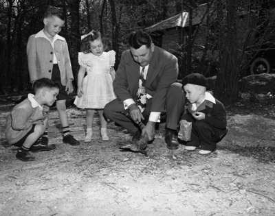 Watching a baby alligator, left to right, are Charles, Arthur and Carolyn Weinman, while Zoo Director Hamilton Hitson holds the 'gator' and John F. Collins Jr. looks on curiously.