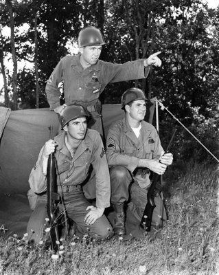Checking The Position - Sergeant First Class. R. L. Hamton, TWC student, pointed to area where 49th Armored Division Headquarters is setting up a command tent. Looking on are Corp. John Tackel, Bridgeport, left, and Master Sergeant Chuck Kimbell of 5012 Flagstaff Drive.
