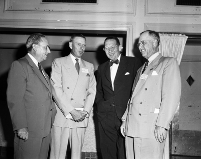 Wichita Falls Visitors - Members of the Wichita Falls Farm and Ranch Club wound up a tour with a banquet here Saturday night. Discussing the tour were, left to right, W. B. Hamilton, Wichita Falls Hereford breeder; J. C. Porter, Wichita Falls banker; novelist Louis Bromfield, who spoke at the banquet, and Leon Deaton, president of the club.