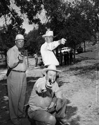 Leveling Down - With their firearms are, kneeling, U. S. Deputy Marshals C. E. Luce, Lubbock; Bill Lampe of Amarillo (left, standing) and Eugene Williams of Abilene, during shooting match at Echo Hills farm of U. S. Marshal Wright.