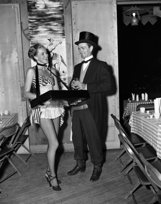 Shades Of The Old West - They came to life in a revived Mint Bar Saturday night when the Fort Worth Art Association held a benefit western party at Pioneer Palace previewing the Mint collection of paintings by Cowboy Artist Charles M. Russell. Left to right, Mrs. Hunter Barrett, who was a cigarette girl for a night at the event, selling her wares to "Dude" Fred M. Lege III.