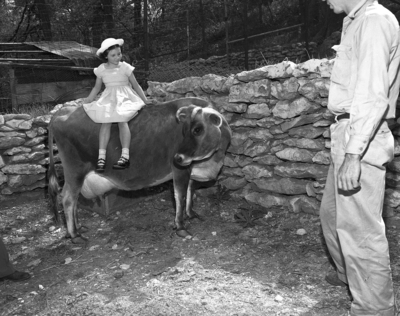 Image shows Eda Ella Pittman, riding the cow. The cow is kept in Forest Park Zoo to supply fresh milk for the baby zoo animals.