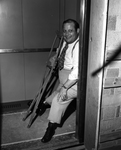 County Clerk Cletus E. Knight, who gets about only on crutches, visited the second and third floors of the Denton County courthouse on the trial run of the new elevator installed in the building. During his five years in office, deputies have represented him at sessions of county court on the second and commissioners courts on the third floor. Published in Fort Worth Star-Telegram morning edition May 26, 1952.