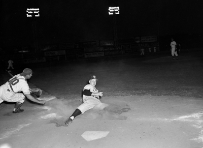 Outfielder Gail Henley of the Oilers slides into the plate with a seventh-inning run as manager Bobby Bragan of the Cats tries in vain for a tag. The runner came in on as an infield grounder to shortstop. Published in Fort Worth Star-Telegram morning edition, June 02, 1952.