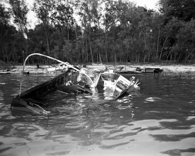 Blown 'Sky High' - Wreckage of a 28-foot cabin cruiser belonging to Odell Allen floats on Eagle Mountain Lake after an explosion Sunday afternoon. Allen and five other persons were injured.