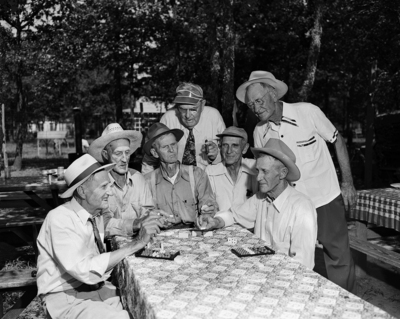 Walton's Convening Here - Seven Walton brothers, who with their families are holding a reunion at Eagle Mountain Lake, are, left to right, S. E. of Odessa, Zack of Goree, W. B. of Kopperl, O. R. of Brownsville (standing), Oscar R. of Fort Worth, A. J. of San Diego, California (standing) and O. L. Walton of Fort Worth.