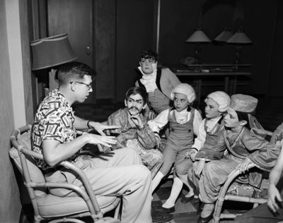 Awaiting Curtain Call - A group of young actors in the Reeder School production "The Happy Hypocrite", listen to a story by Jonh Walsh just before the opening performance Monday night at TCU's Little Theater. The children, left to right,are Roy Lee Main, Vaughn Johns, Janet Jenkins and Sue Strube. Standing is Sam Cantey.