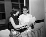New Students - Kathryn Hallmark of Munday, a vacation visitor at the home of her sister, Miss Frances Hallmark, 3824 Clarke, gets acquainted with another summer school student. He is Dick Childers, son of Mr. and Mrs. R. R. Childers, 37221 Westridge. They enrolled Monday for high school work at Ernest Parker Junior High School.