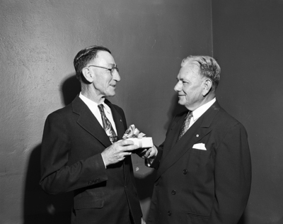 Telegrapher Honored - Edward C. Tuffly, left, Morse code telegrapher for Gulf Oil Corporation here, receives a present from M. B. Ownby, telegraph superintendent at the company, at a dinner in Tuffly's honor Monday. He retires in July after a half century as a telegrapher.